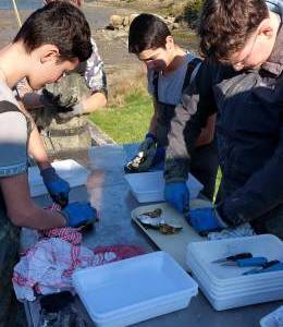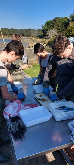 Le premier jour, les élèves ont été accueillis en atelier de ramendage/matelotage. Le groupe a ensuite découvert le parc conchylicole pour y retourner quelques poches d’huîtres. L'atelier suivant avait pour objectif de leur présenter le calcul de l'indice de remplissage sur un lot d’huîtres creuses et de l'indice de forme, avant de leur permettre de réaliser également un tri.