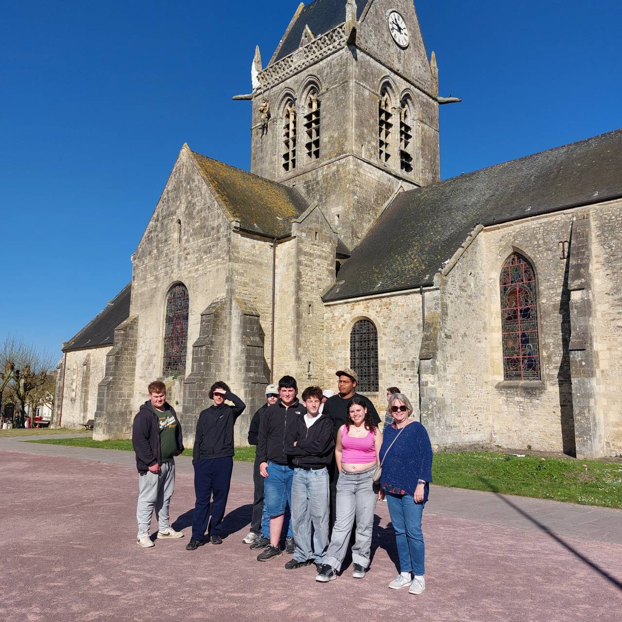 La matinée a débuté à Sainte-Mère-Église. Les élèves ont pu lever les yeux vers le célèbre clocher où le parachutiste John Steele est resté accroché. Ensuite direction le cimetière militaire américain.